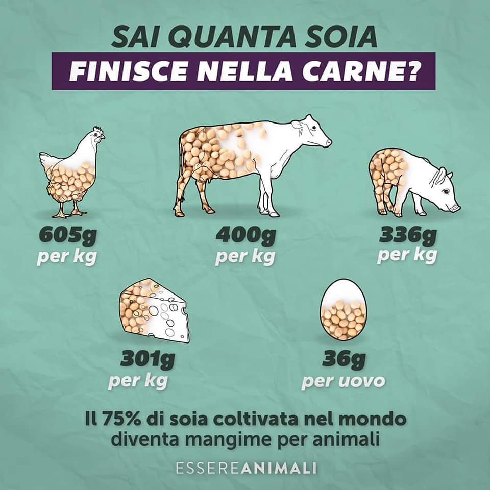 - I terreni utilizzati per produrre mangimi potrebbero essere utilizzati per la produzione di alimenti vegetali per l’uomo; Sapevi che la soia viene prodotta principalmente per nutrire gli animali? Serve tantissimo mangime che comprende cereali, soia e granturco; Tutti terreni coltivabili che potrebbero essere destinati all’essere umano. Sai qual è la percentuale di cibo che ingerisci che non proviene dal nostro Paese? La soia viene anche utilizzata in diverse forme nella preparazione di comuni alimenti presenti al supermercato. (oro ciok, pan di stelle eccetera). E’ vero che piantando soia stiamo arrecando danni irreparabili agli ecosistemi di tutto il pianeta, ma se la domanda di prodotti animali diminuisse o meglio cessasse, la richiesta di soia (e degli altri alimenti) diminuirebbe drasticamente come anche lo sfruttamento di risorse naturali.