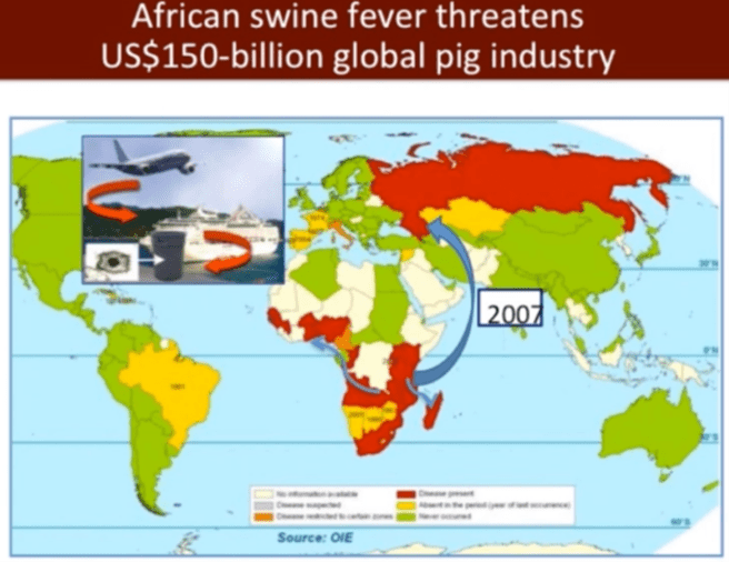 Molto probabilmente dall‘Angola, infatti il suo primo ingresso registrato è in Portogallo. Da lì si è diffusa nella Penisola Iberica e poi, dagli anni ’60, in altre parti dell’Europa, arrivando anche in Italia (Sardegna), Spagna, Francia fino ad arrivare in Olanda. Allo stesso tempo le esportazioni e le movimentazioni commerciali con il Brasile hanno portato il problema anche in America meridionale, fino ai Caraibi: ci sono state diverse epidemie a Cuba, ad Haiti, nella Repubblica Domenicana, nelle zone del sud America. Si pensa anche che ci siano stati degli attacchi bio-terroristici per la Peste Suina Africana, in particolare a Cuba. In Sardegna è presente ed endemica ormai da molto tempo (forse arrivata dalla Penisola Iberica alla fine degli anni ‘70); la situazione si sta gestendo perché qui è presente il genotipo 1 che non è molto pericoloso e quasi non da sintomi; la presenza di animali sieropositivi fa sì comunque che i prodotti sardi a base di suino facciano fatica ad essere esportati.